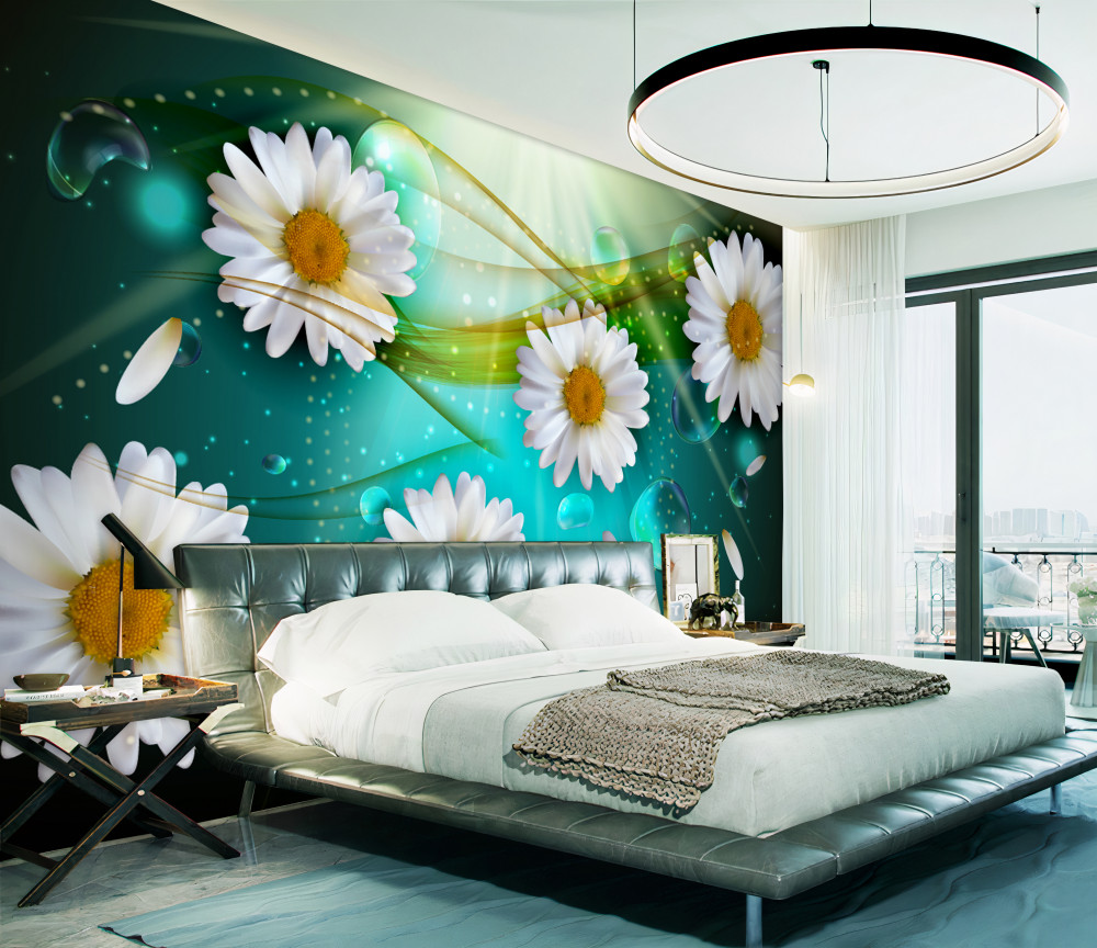 Tapeta Fototapeta krople wody na białe stokrotki (artykuł a90394 ) z kategorii Fototapety Kwiaty 3D