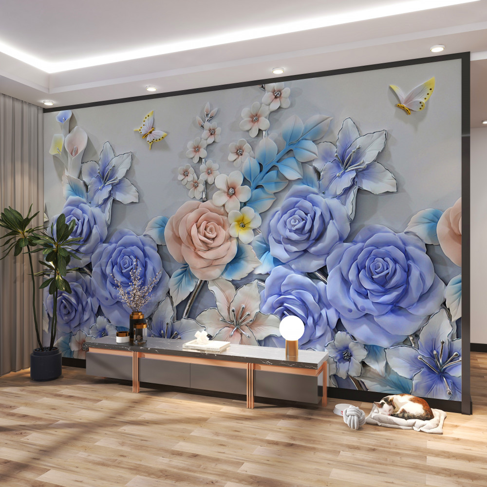Tapeta Fototapeta motyle latają nad różami i liliami (artykuł a92532 ) z kategorii Fototapety Kwiaty 3D