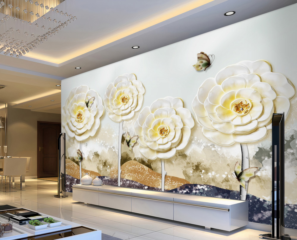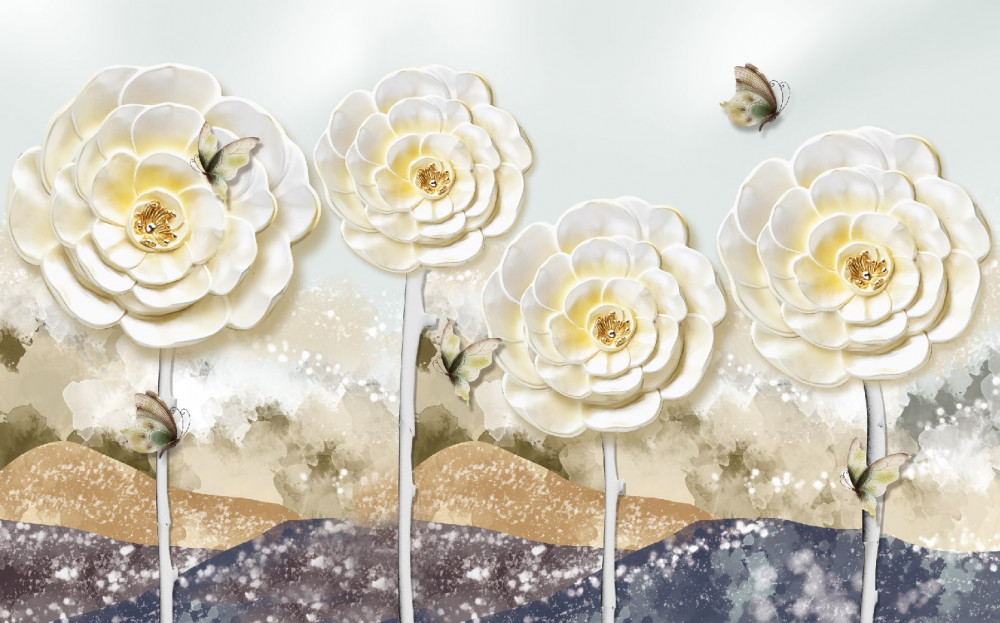 Tapeta Fototapeta motyle obok dużych kremowych kwiatów (artykuł pb4478 ) z kategorii Fototapety Kwiaty 3D