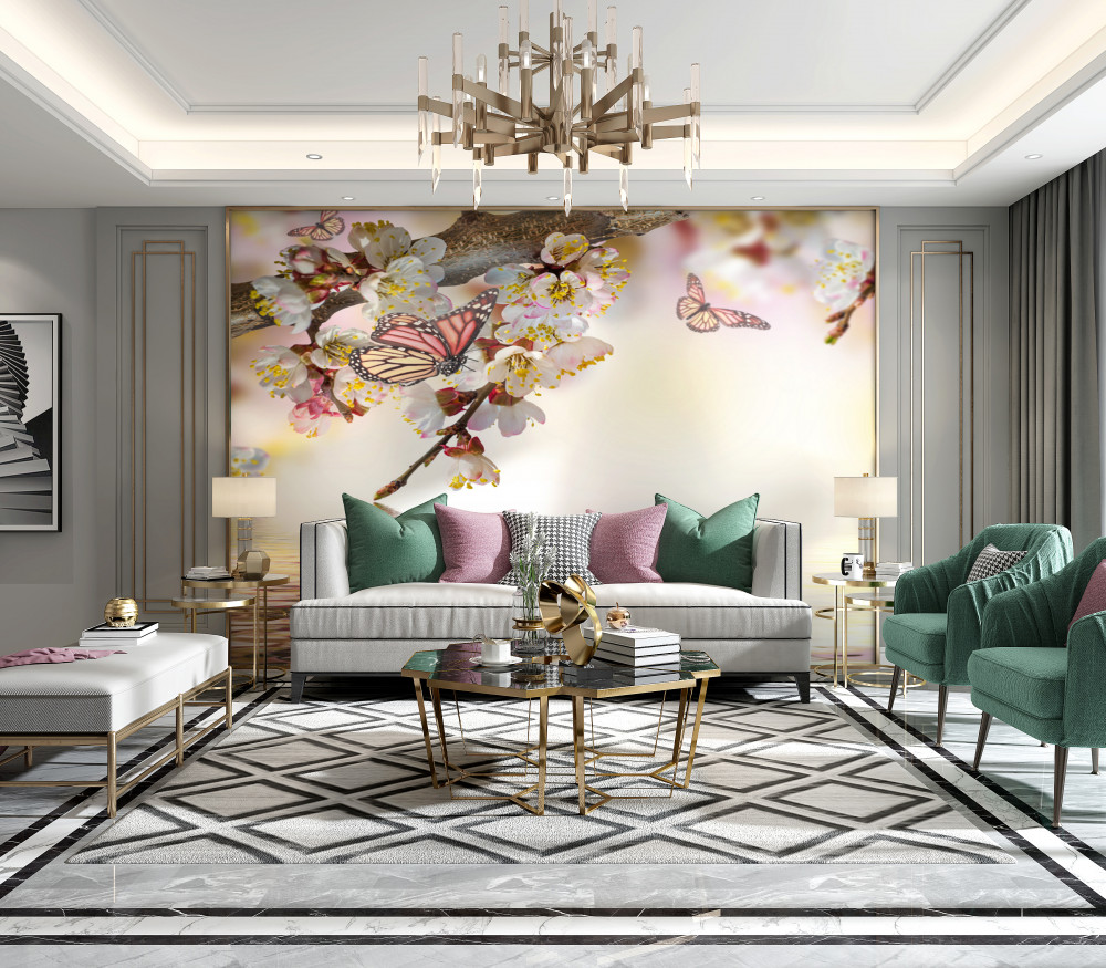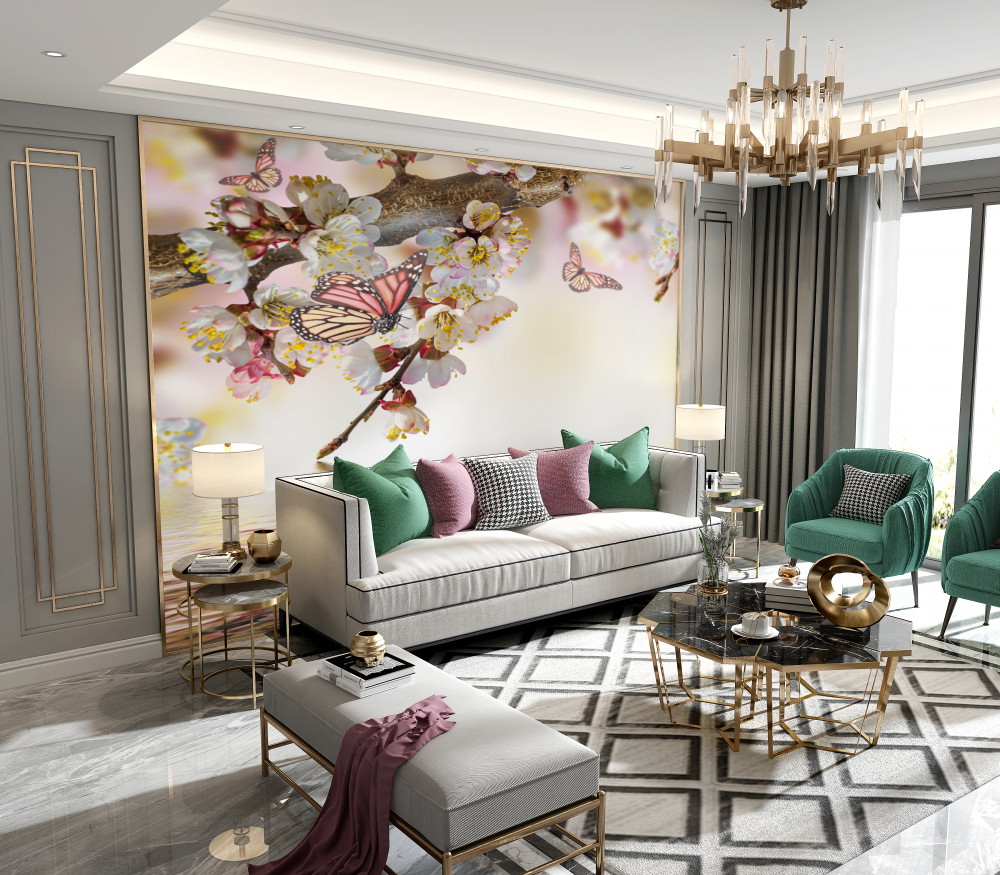 Tapeta Fototapeta motyle osiadły na kwiatach sakury (artykuł a89713 ) z kategorii Fototapety Kwiaty 3D