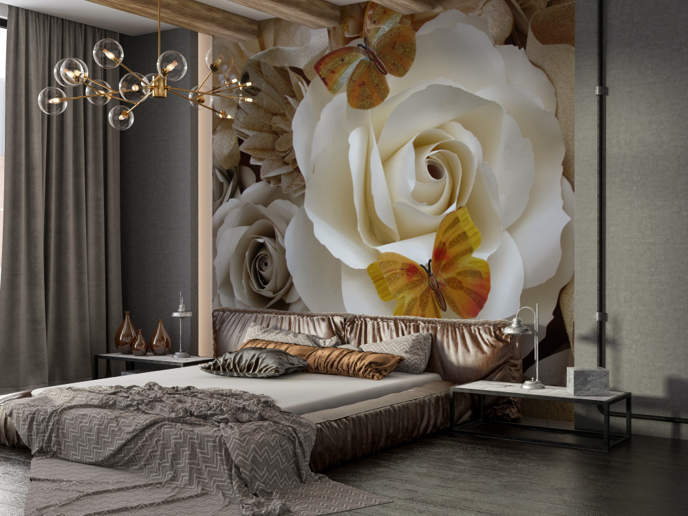 Tapeta Fototapeta motyle osiedliły się w dużym białym lesie (artykuł a89716 ) z kategorii Fototapety Kwiaty 3D