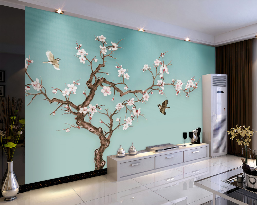 Tapeta Fototapeta ptaki latają nad drzewem z białymi kwiatami (artykuł a91651 ) z kategorii Fototapety Kwiaty 3D