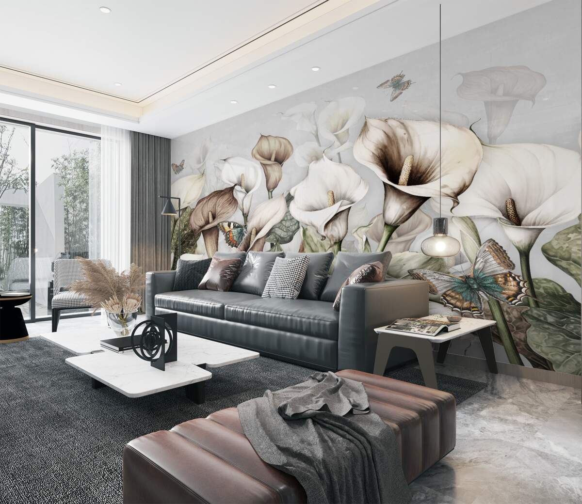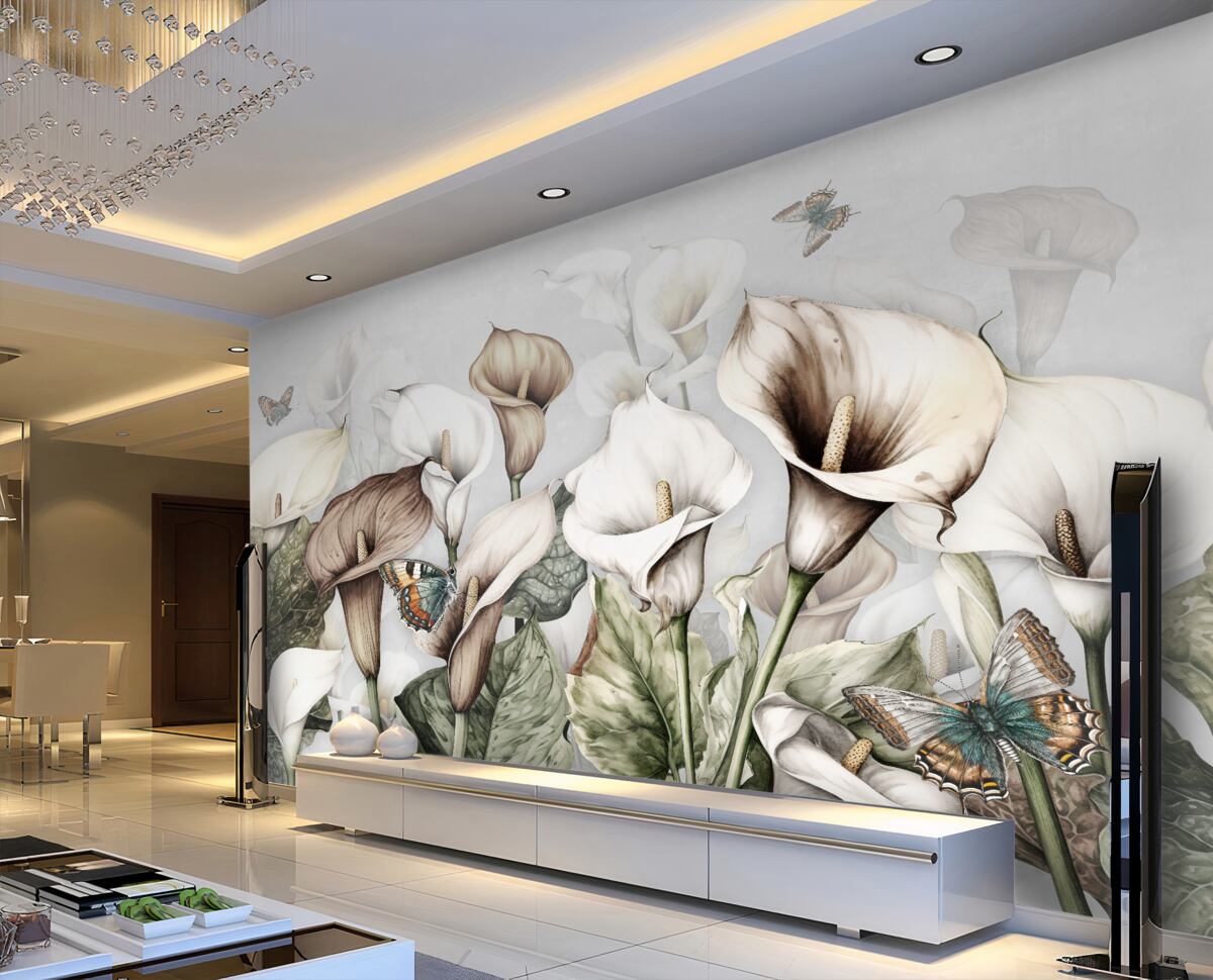 Tapeta Fototapeta Białe i brązowe kalie z motylami (artykuł a98258 ) z kategorii Fototapety Kwiaty