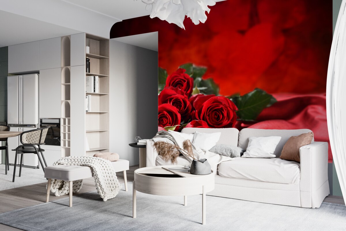 Tapeta Fototapeta Czerwone róże na czerwonej satynie (artykuł a97385 ) z kategorii Fototapety Kwiaty