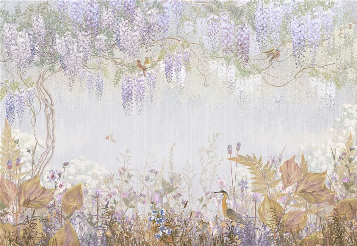 Tapeta Fototapeta Drzewo z fioletowymi kwiatami i ptakami (artykuł a97876 ) z kategorii Fototapety Kwiaty