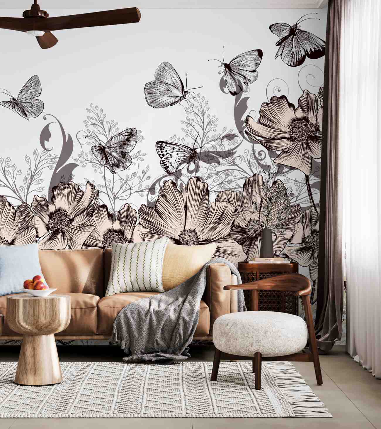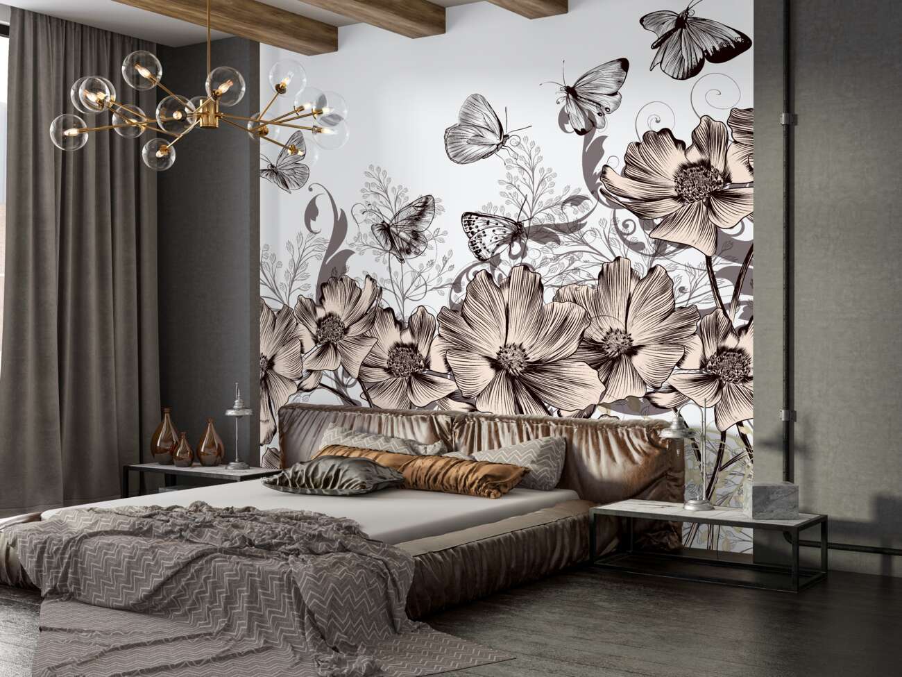Tapeta Fototapeta Maki i motyle czarne -białe (artykuł u11629 ) z kategorii Fototapety Kwiaty