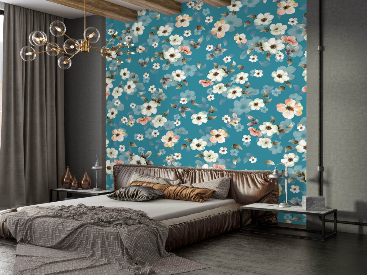 Tapeta Fototapeta Małe kwiaty na niebieskim tle (artykuł a92827 ) z kategorii Fototapety Kwiaty