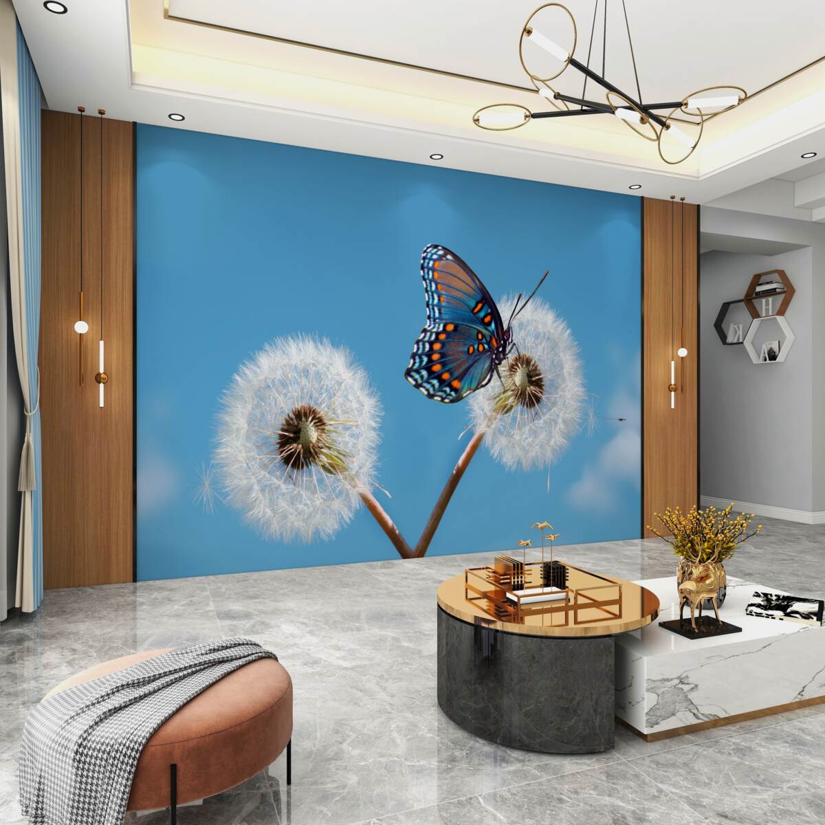 Tapeta Fototapeta Motyl na wyblakłym mniszku lekarskim (artykuł a97651 ) z kategorii Fototapety Kwiaty