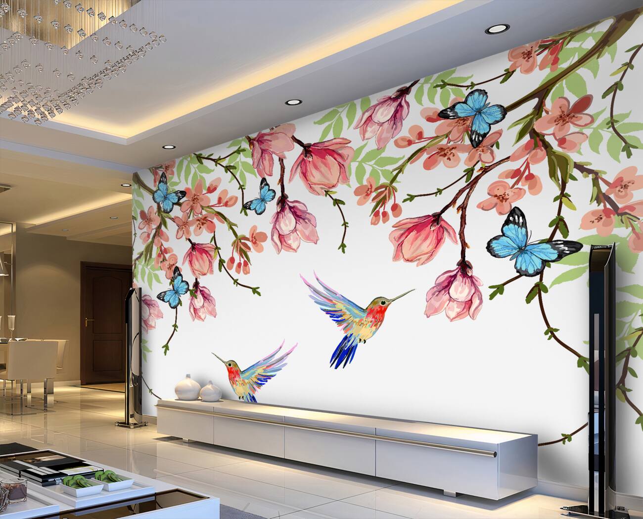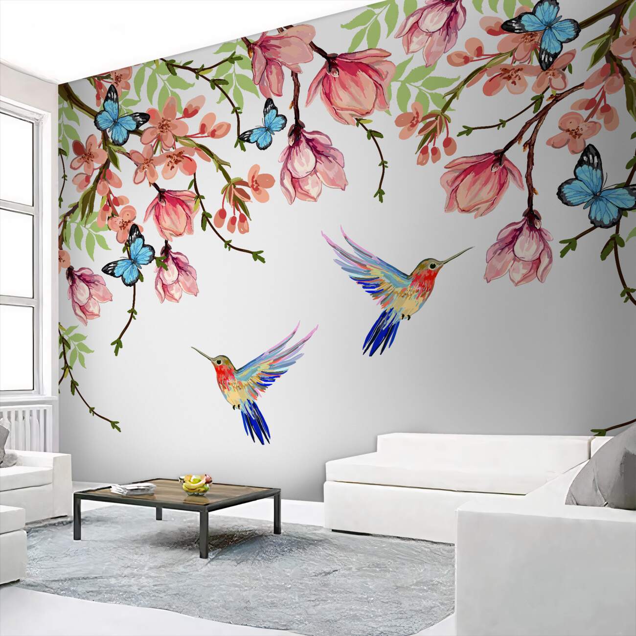 Tapeta Fototapeta Motyle i kolibry na kwiatach (artykuł u13977 ) z kategorii Fototapety Kwiaty