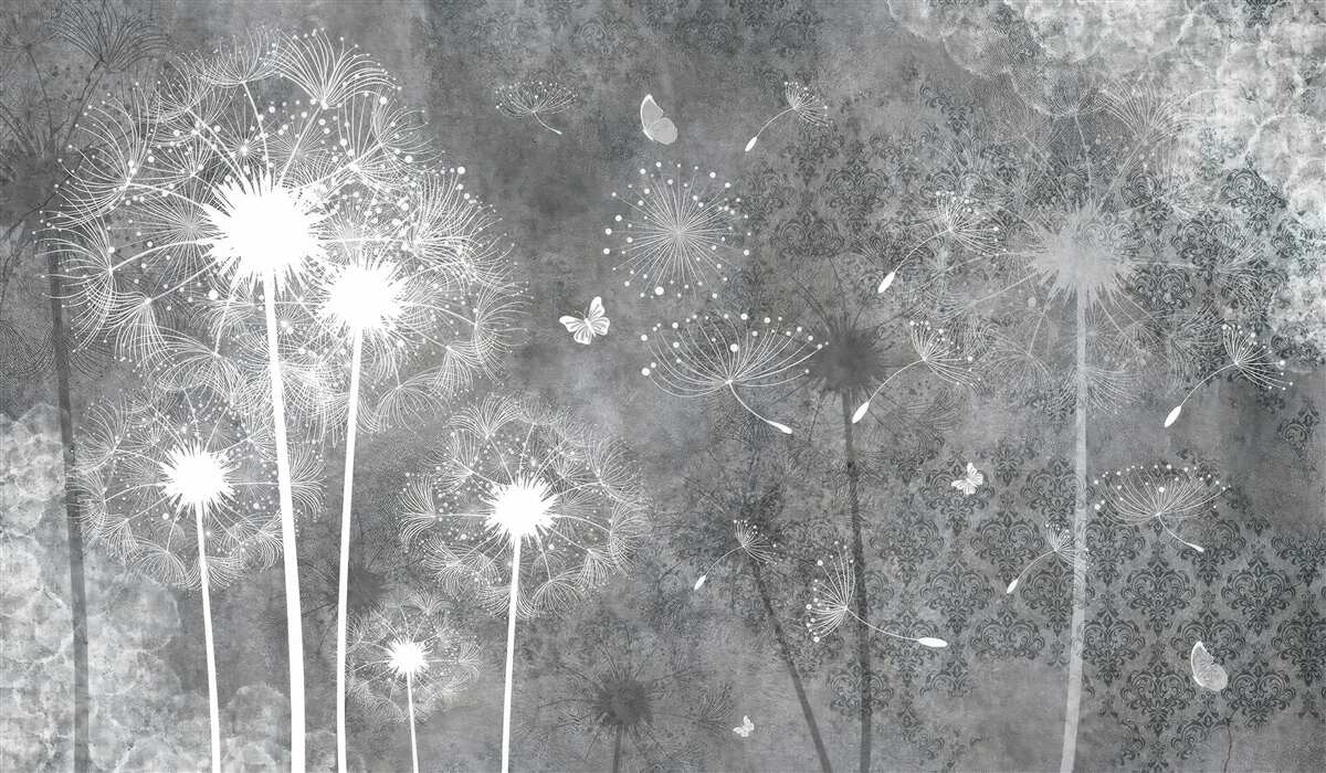 Tapeta Fototapeta Szare tło z białymi sylwetkami mniszek lekarski (artykuł a97885 ) z kategorii Fototapety Kwiaty