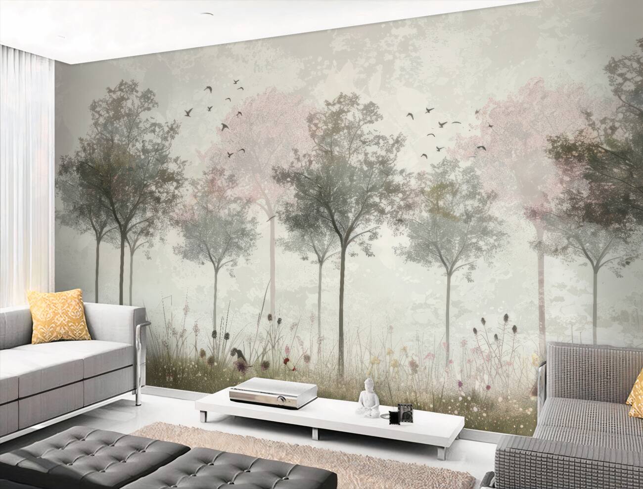 Tapeta Fototapeta Drzewa i ptaki we mgle (artykuł u14263 ) z kategorii Fototapety Las