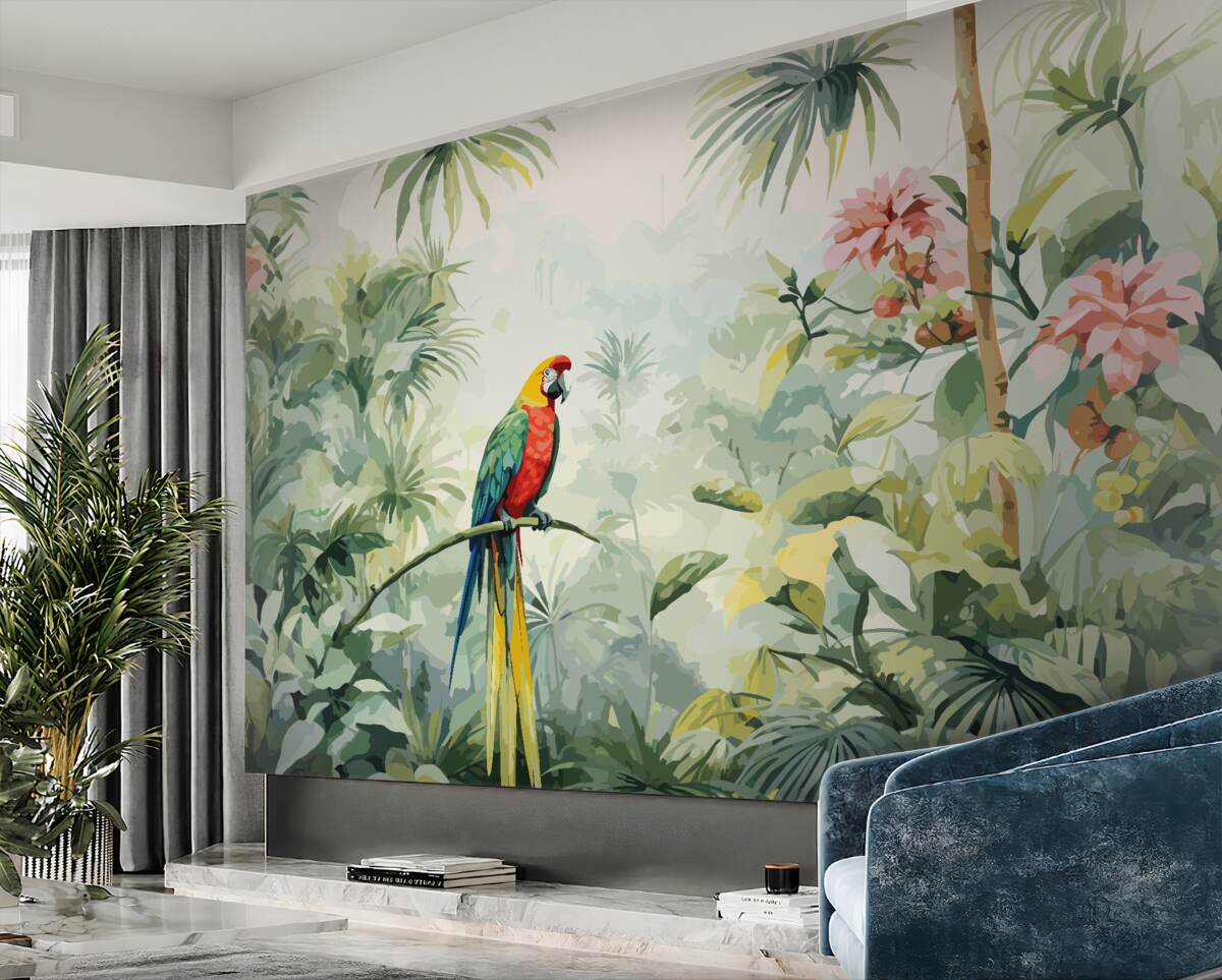 Tapeta Fototapeta Gęsta zielona dżungla i papuga (artykuł a98543 ) z kategorii Fototapety Las