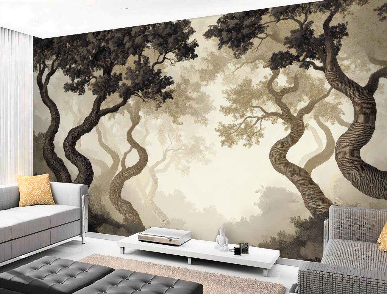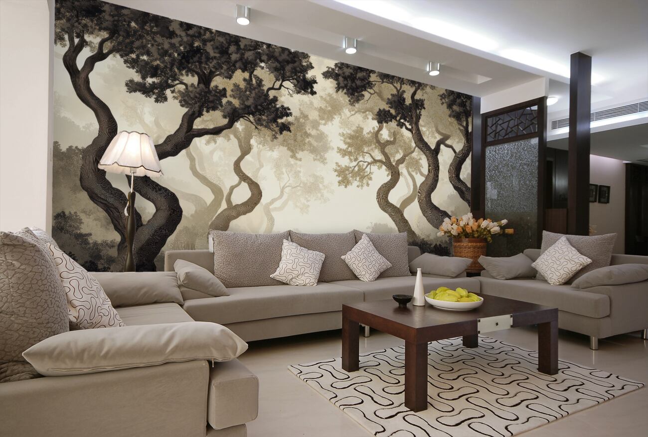 Tapeta Fototapeta Pokręcone drzewa w mglistym lesie (artykuł u14387 ) z kategorii Fototapety Las