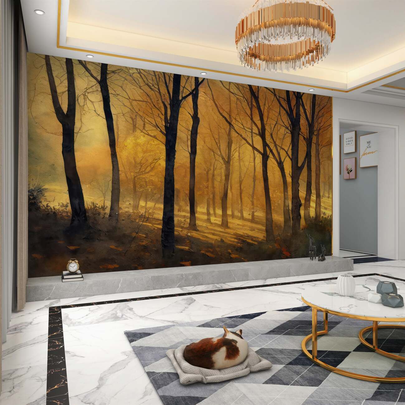Tapeta Fototapeta Promienie Słońca przebijają się w mglistym jesiennym lesie (artykuł u14320 ) z kategorii Fototapety Las
