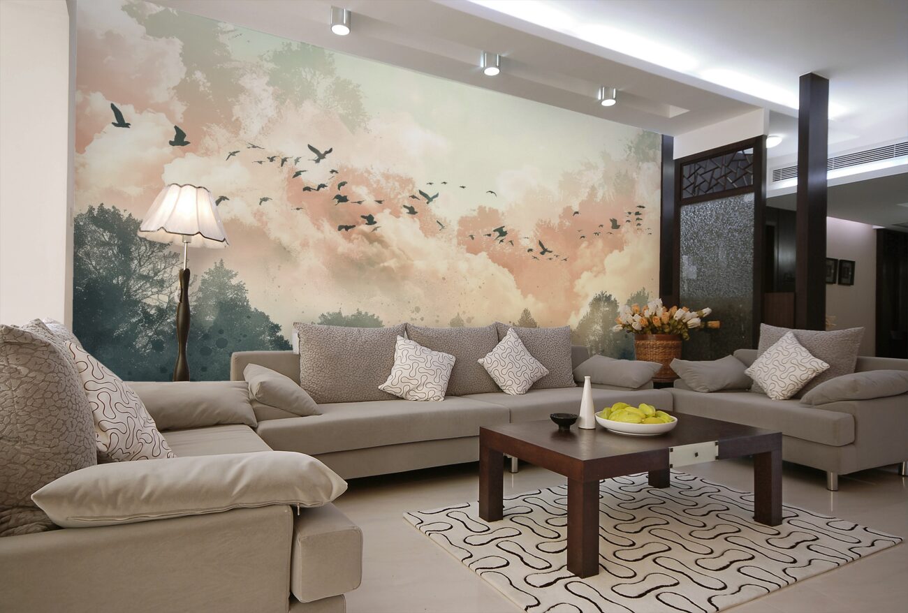 Tapeta Fototapeta Ptaki latają przez las (artykuł u14323 ) z kategorii Fototapety Las