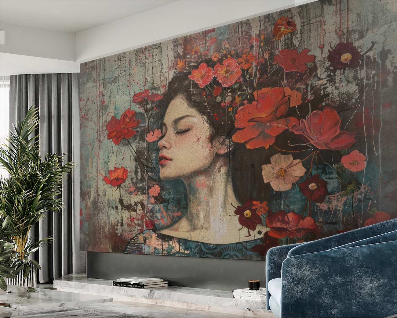 Tapeta Fototapeta Dziewczyna na obrazie z czerwonymi kwiatami (artykuł u14200 ) z kategorii Fototapety Ludzie