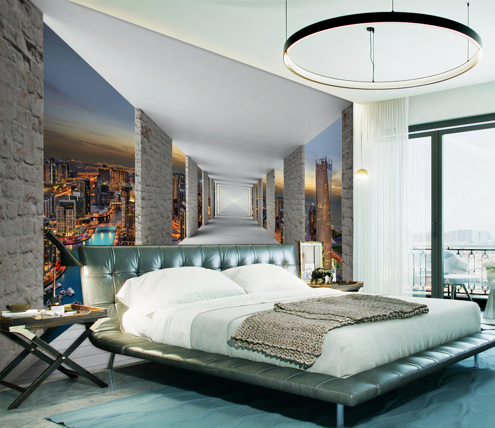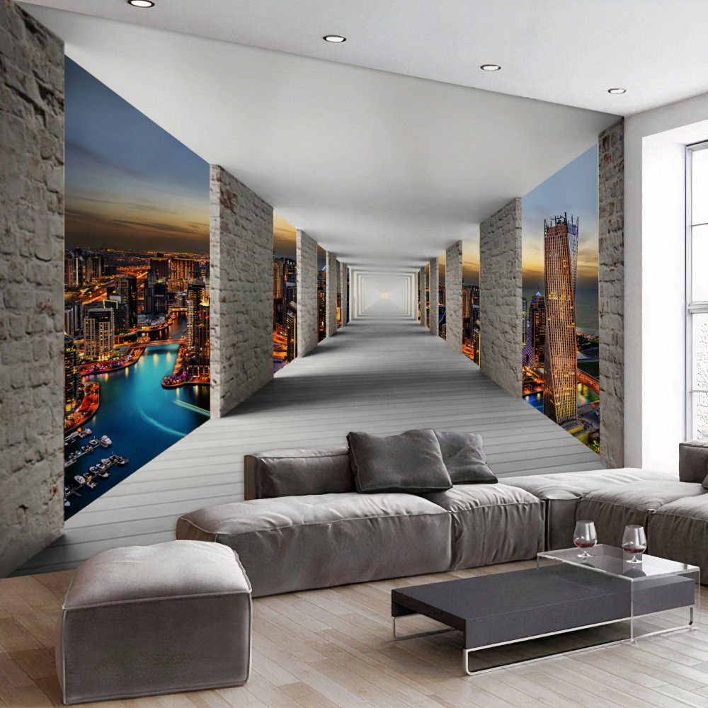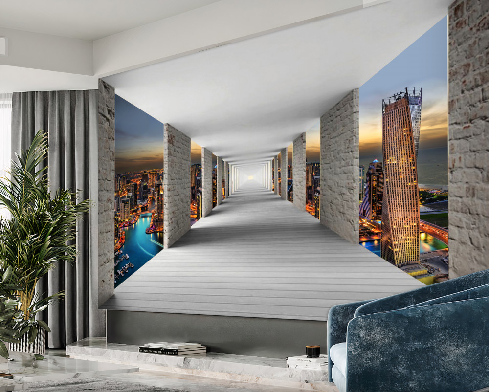 Tapeta Fototapeta Korytarz 3d nad miastem (artykuł a90365 ) z kategorii Fototapety Miasta i kraje