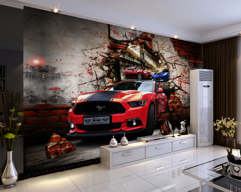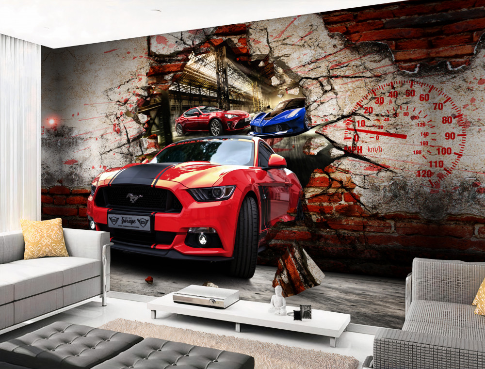 Tapeta Fototapeta czerwony mustang w ścianie (artykuł a90686 ) z kategorii Fototapety Młodzieżowe