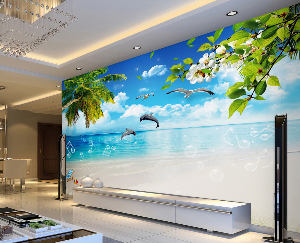 Tapeta Fototapeta delfiny i mewy nad morzem (artykuł a92017 ) z kategorii Fototapety Morze i plaża