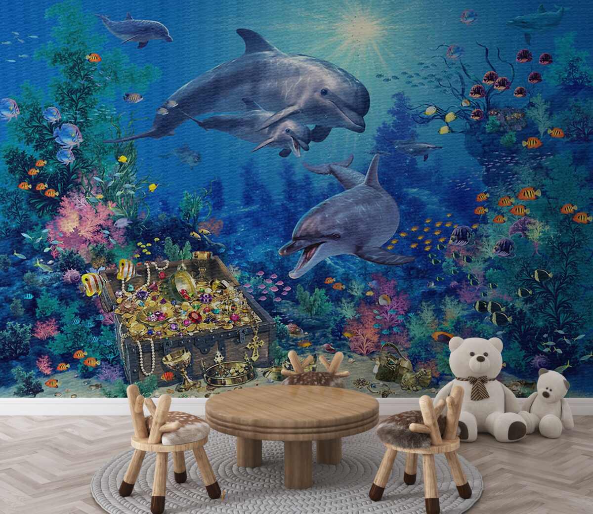 Tapeta Fototapeta Delfiny znalazły skarb (artykuł a94238 ) z kategorii Fototapety Morze i plaża