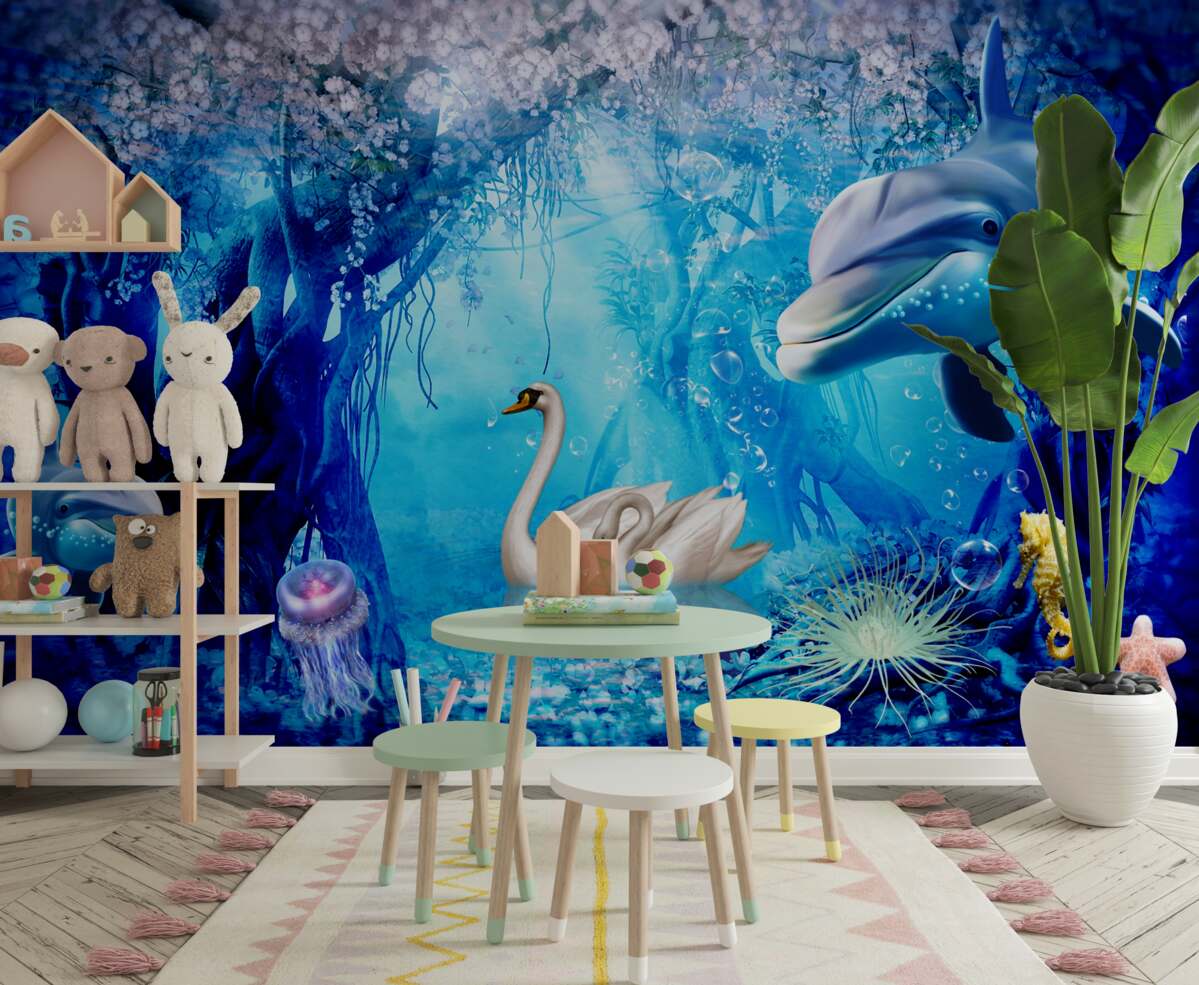 Tapeta Fototapeta Łabędzie i delfiny pod wodą (artykuł a96455 ) z kategorii Fototapety Morze i plaża