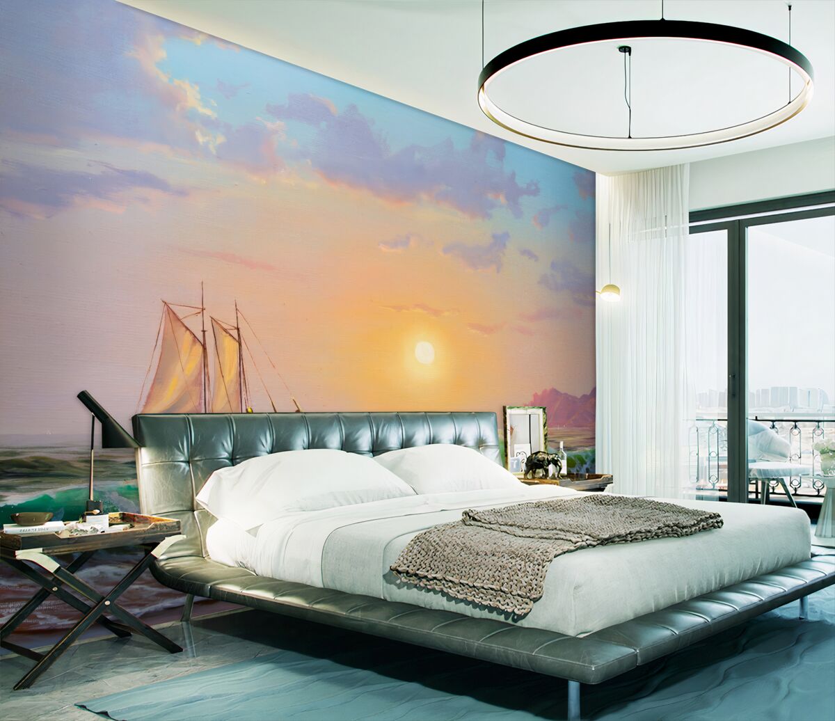 Tapeta Fototapeta Statek płynie w stronę zachodzącego słońca (artykuł a97406 ) z kategorii Fototapety Morze i plaża