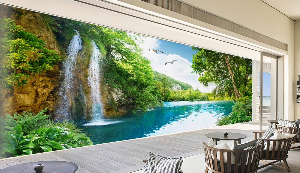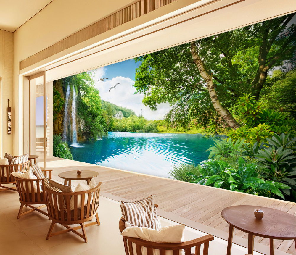 Tapeta Fototapeta bajeczna przyroda wokół wodospadu i jeziora (artykuł a90141 ) z kategorii Fototapety Natura