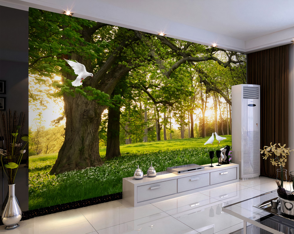 Tapeta Fototapeta białe gołębie o świcie w zielonym lesie (artykuł a92214 ) z kategorii Fototapety Natura
