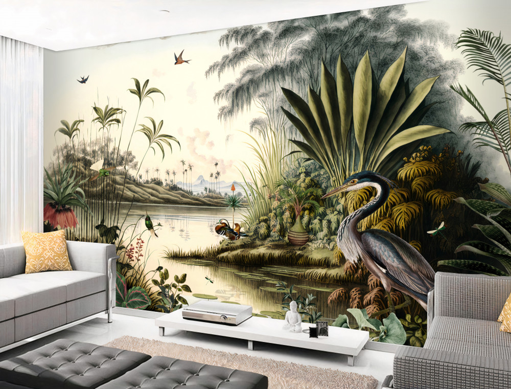 Tapeta Fototapeta czapla nad zielonym stawem (artykuł a89240 ) z kategorii Fototapety Natura