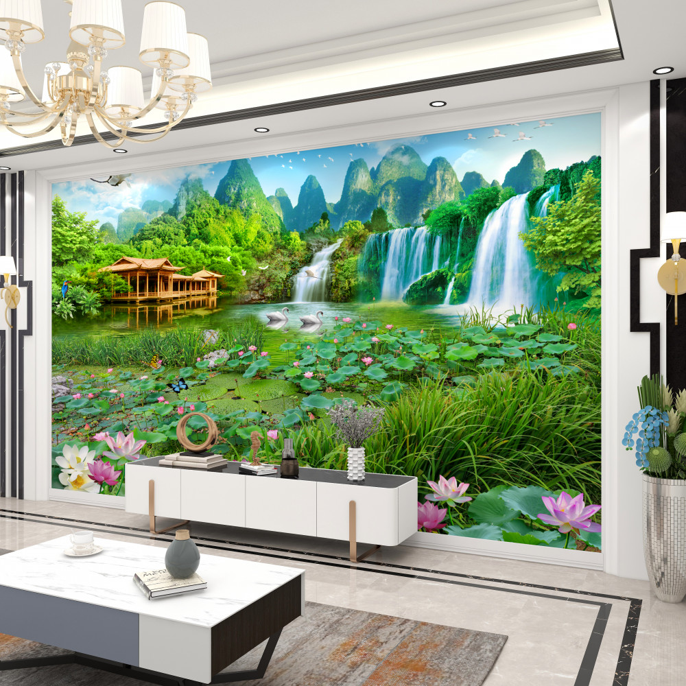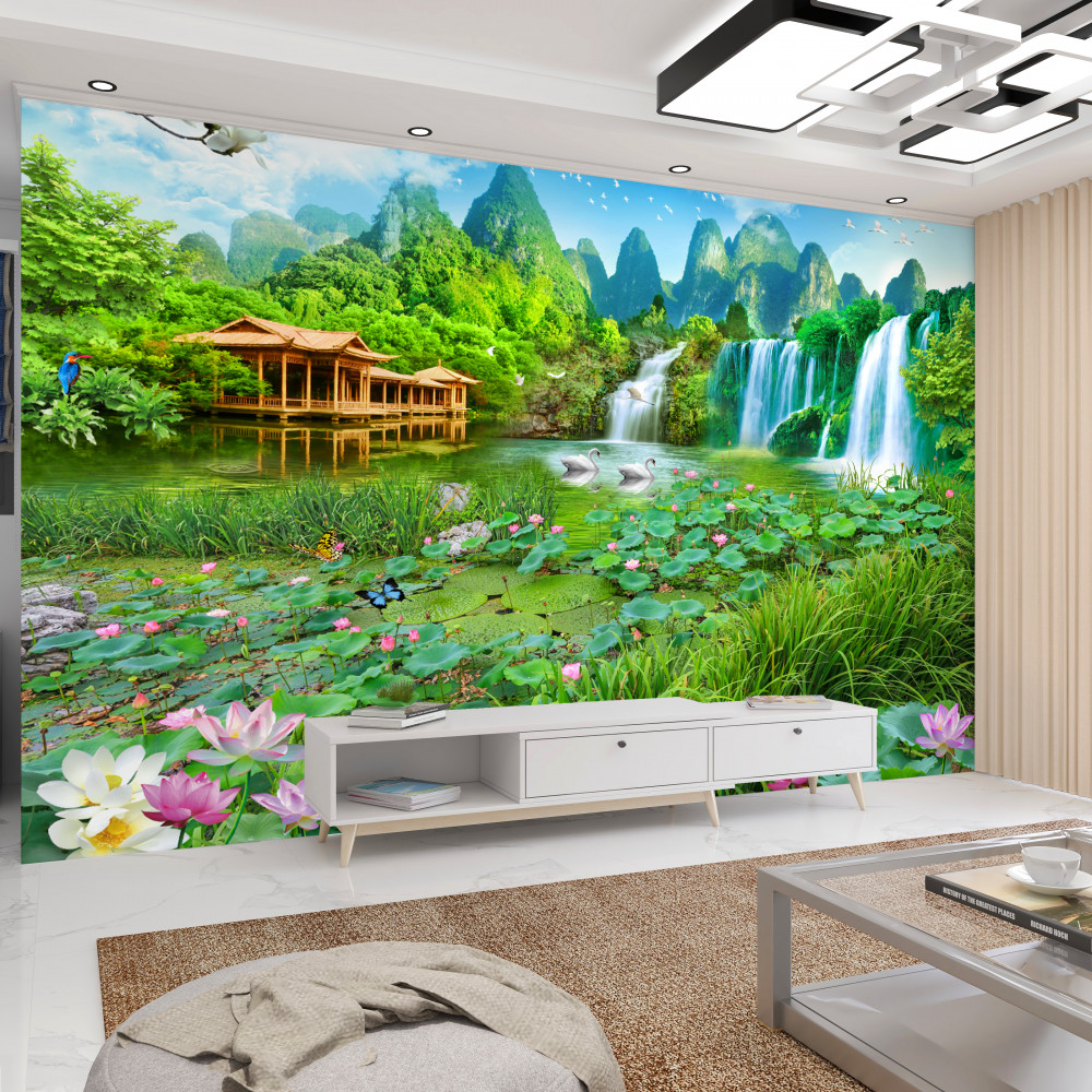 Tapeta Fototapeta dom obok wodospadu wpadającego do jeziora (artykuł a91660 ) z kategorii Fototapety Natura