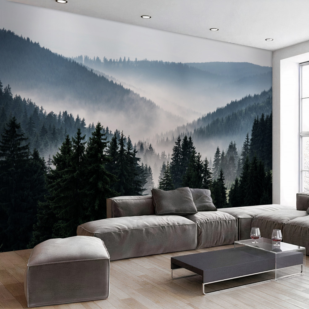 Tapeta Fototapeta gęsta mgła pokrywa górski las iglasty (artykuł a93034 ) z kategorii Fototapety Natura