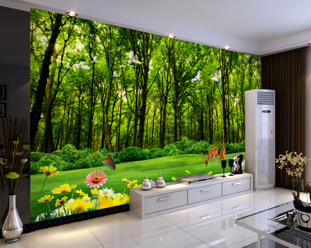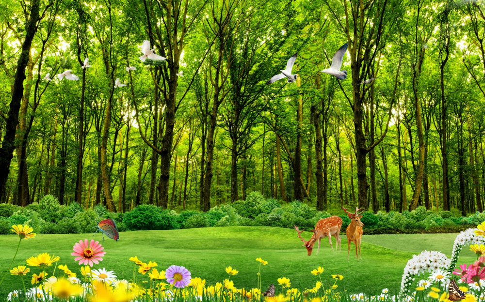 Tapeta Fototapeta jelenie pasące się na łące w zielonym lesie (artykuł a91682 ) z kategorii Fototapety Natura