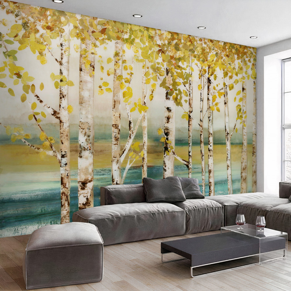 Tapeta Fototapeta jezioro za jesiennym gajem brzozowym (artykuł a91932 ) z kategorii Fototapety Natura