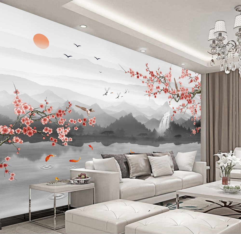Tapeta Fototapeta kwiaty wiśni u podnóża gór i wody (artykuł a94093 ) z kategorii Fototapety Natura
