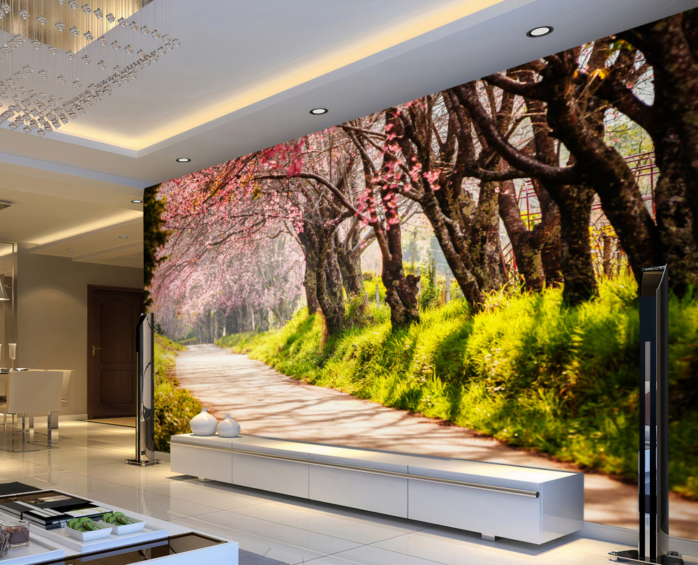 Tapeta Fototapeta kwitnące drzewa przy cichej drodze (artykuł a90631 ) z kategorii Fototapety Natura