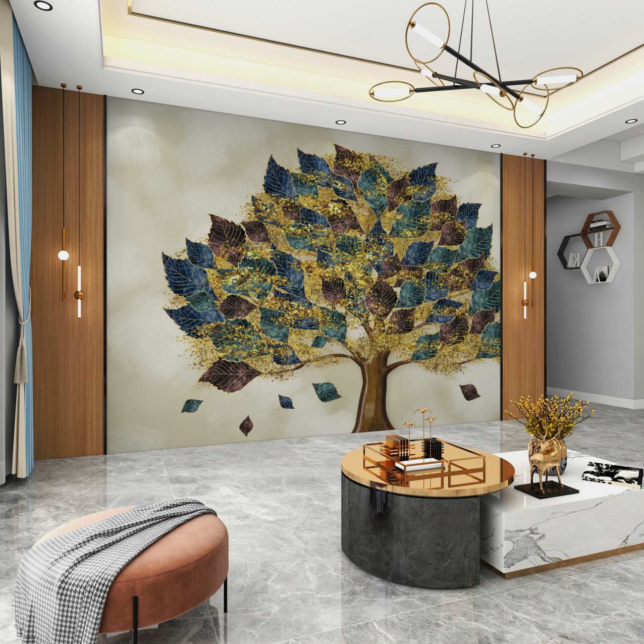 Fototapeta Kwitnące złote drzewo z niebieskimi liśćmi