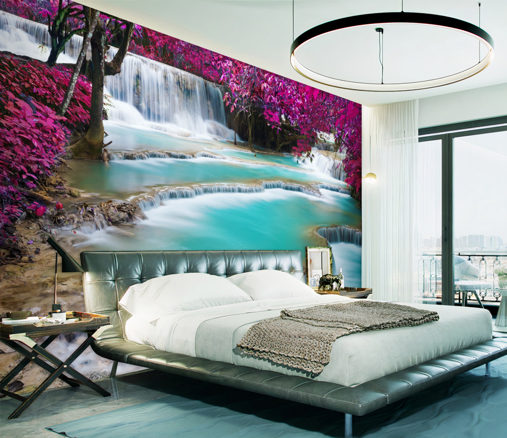 Tapeta Fototapeta kwitnący liliowy u podnóża wodospadu (artykuł a93997 ) z kategorii Fototapety Natura