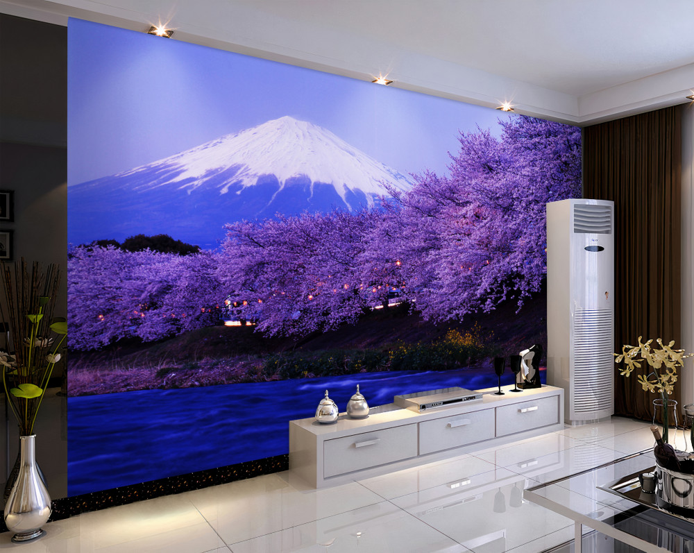 Tapeta Fototapeta liliowe kwiaty drzew w pobliżu wody u podnóża góry (artykuł a93093 ) z kategorii Fototapety Natura
