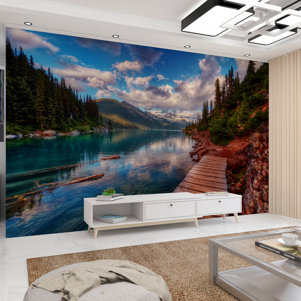 Tapeta Fototapeta most prowadzący do lasu w pobliżu górskiego jeziora (artykuł a93031 ) z kategorii Fototapety Natura