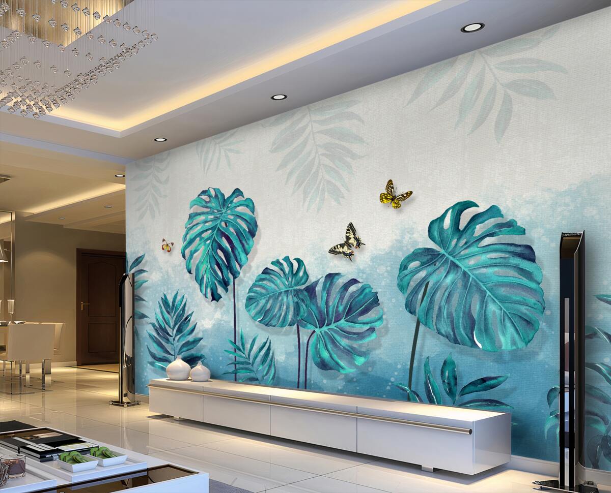 Tapeta Fototapeta Niebieskie liście monstery z motylami (artykuł a98963 ) z kategorii Fototapety Natura