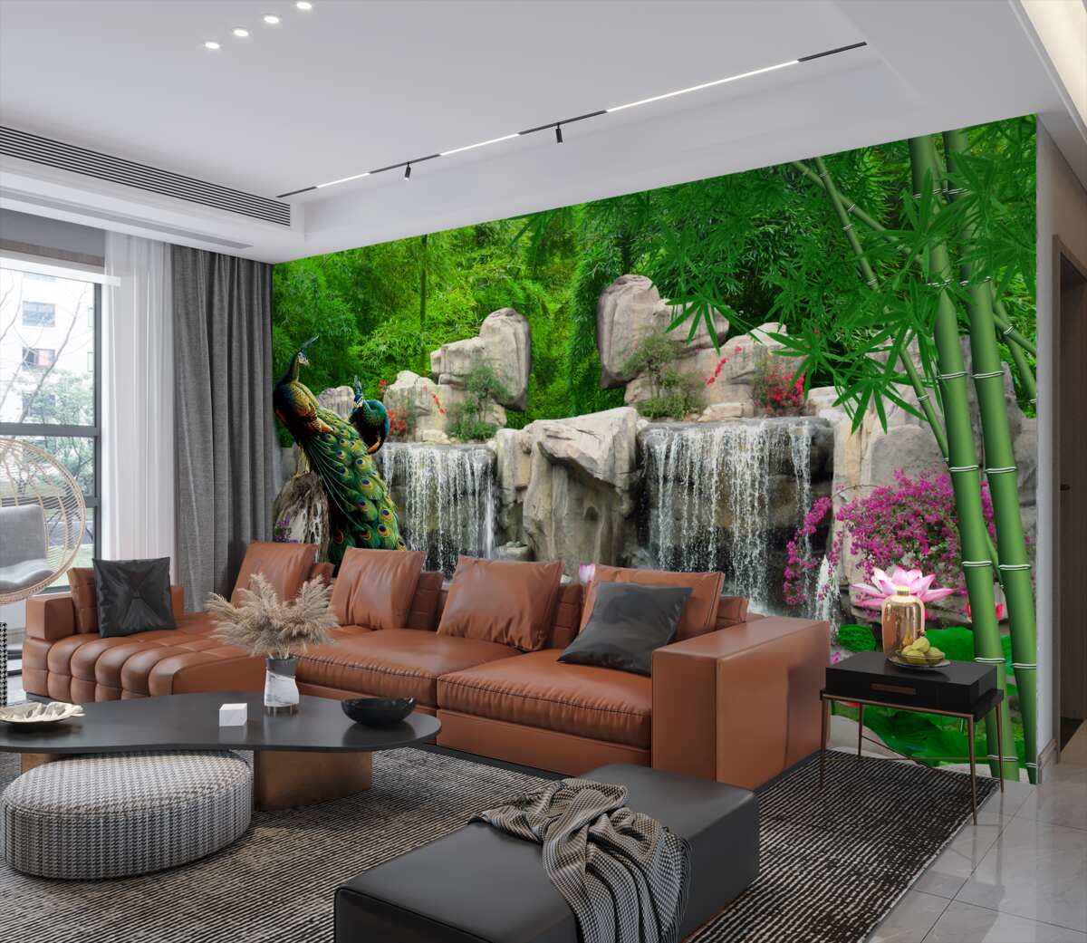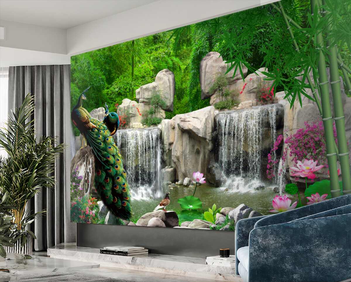 Tapeta Fototapeta Pawie odpoczywa w pobliżu wodospadu (artykuł a98784 ) z kategorii Fototapety Natura