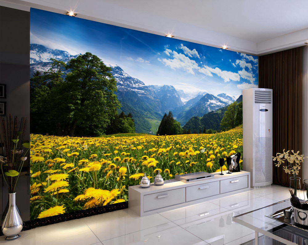 Tapeta Fototapeta pole żółtych mleczy z widokiem na góry (artykuł a93037 ) z kategorii Fototapety Natura