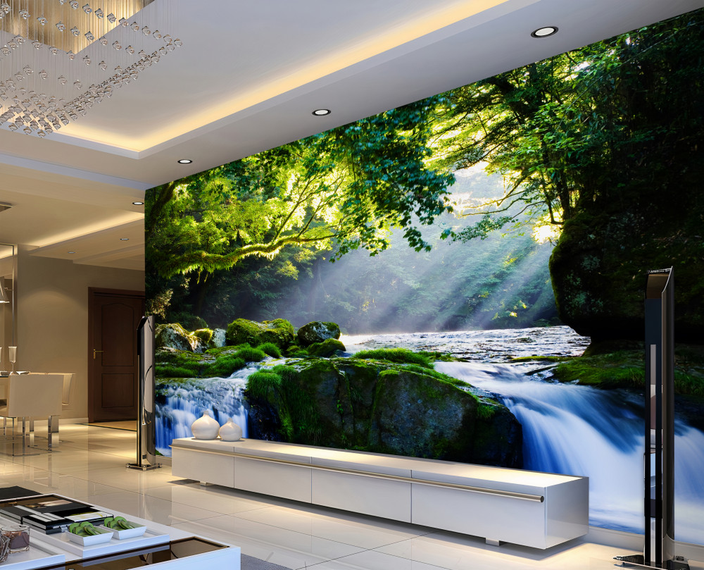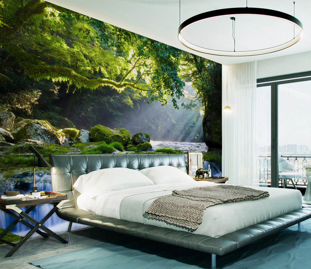 Tapeta Fototapeta promienie słońca docierają do leśnego wodospadu (artykuł a93068 ) z kategorii Fototapety Natura