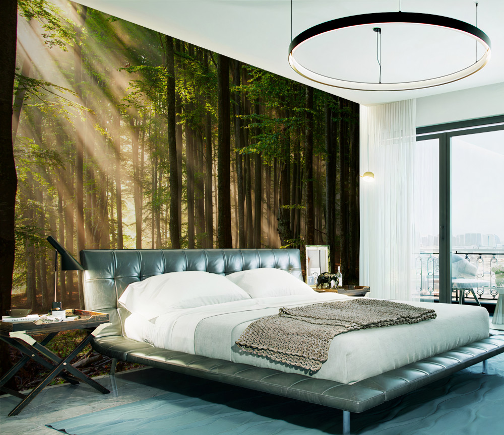 Tapeta Fototapeta promienie słońca ogrzewają zimny las po nocy (artykuł a92955 ) z kategorii Fototapety Natura