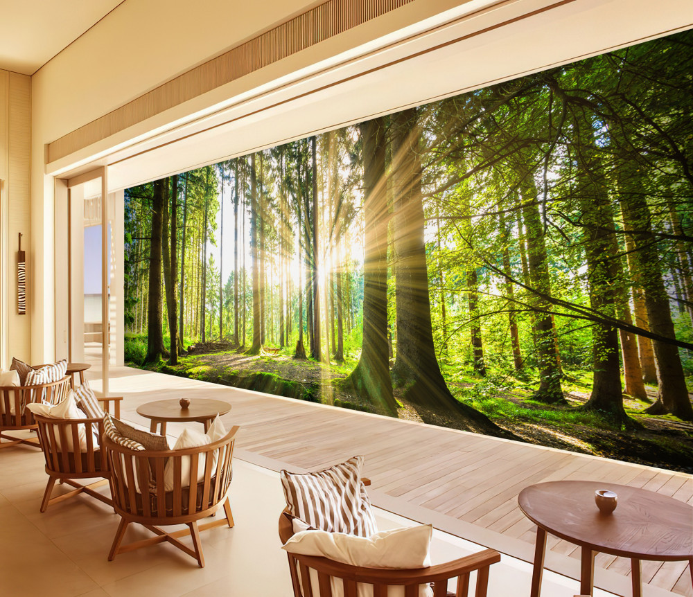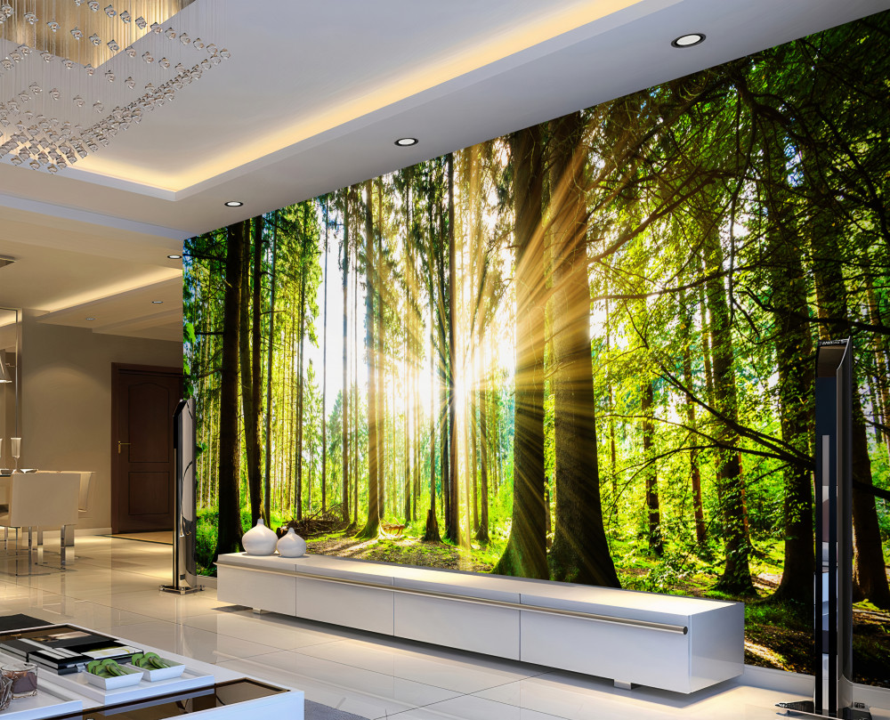 Tapeta Fototapeta promienie słońca wśród smukłych drzew (artykuł a92711 ) z kategorii Fototapety Natura