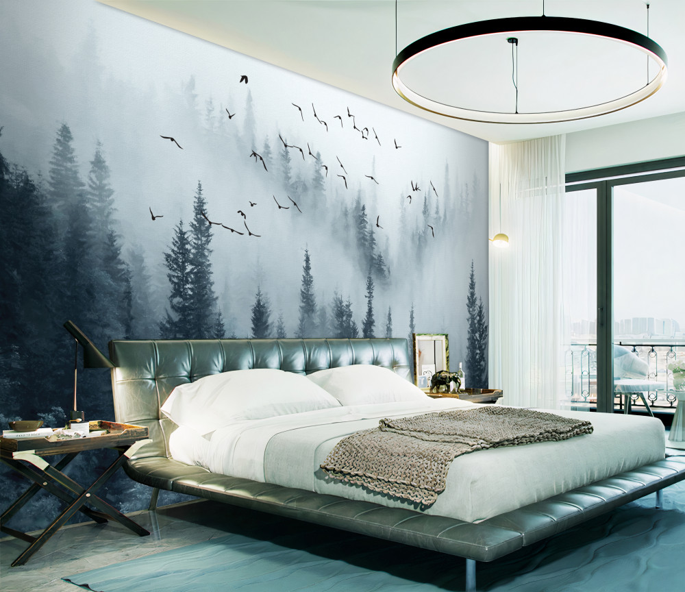 Tapeta Fototapeta ptaki latają nad mglistym lasem (artykuł a90374 ) z kategorii Fototapety Natura