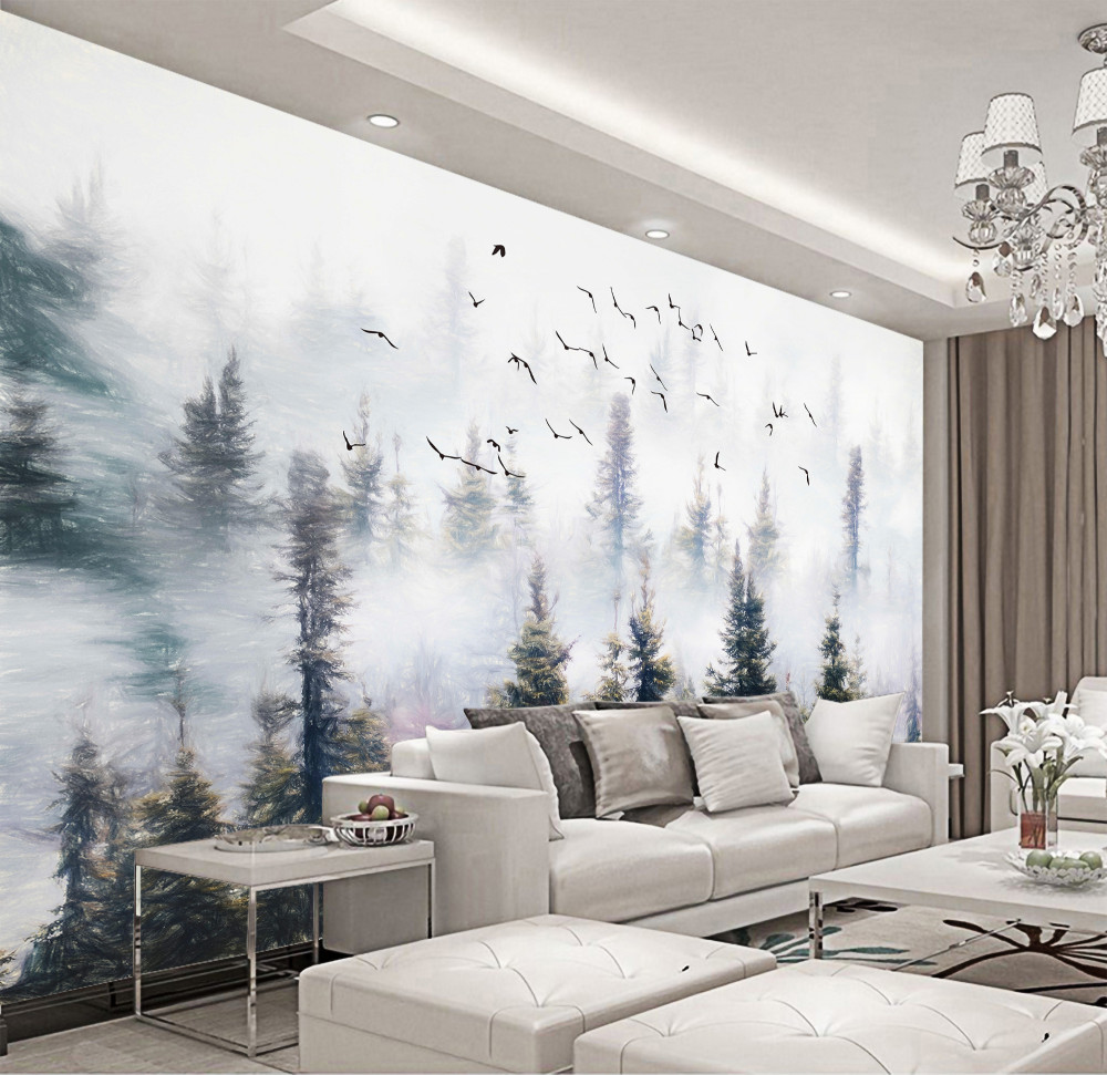 Tapeta Fototapeta ptaki latają nad mglistym lasem iglastym (artykuł a94427 ) z kategorii Fototapety Natura