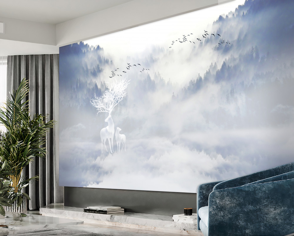 Tapeta Fototapeta rodzina jeleniowatych w mglistym lesie (artykuł a91766 ) z kategorii Fototapety Natura