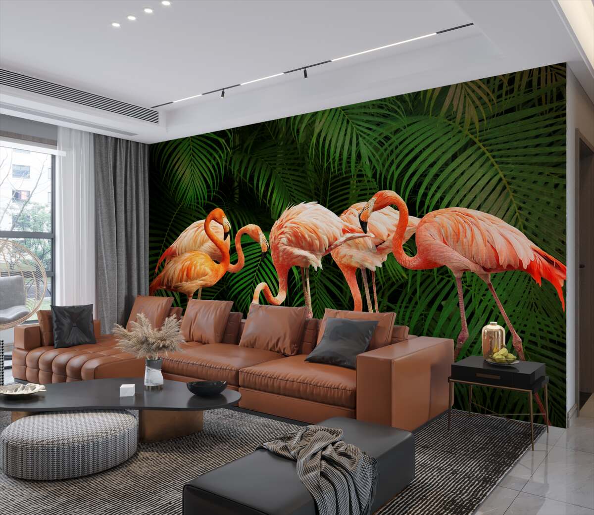 Tapeta Fototapeta Różowy flaming w zielonym lesie (artykuł a98744 ) z kategorii Fototapety Natura