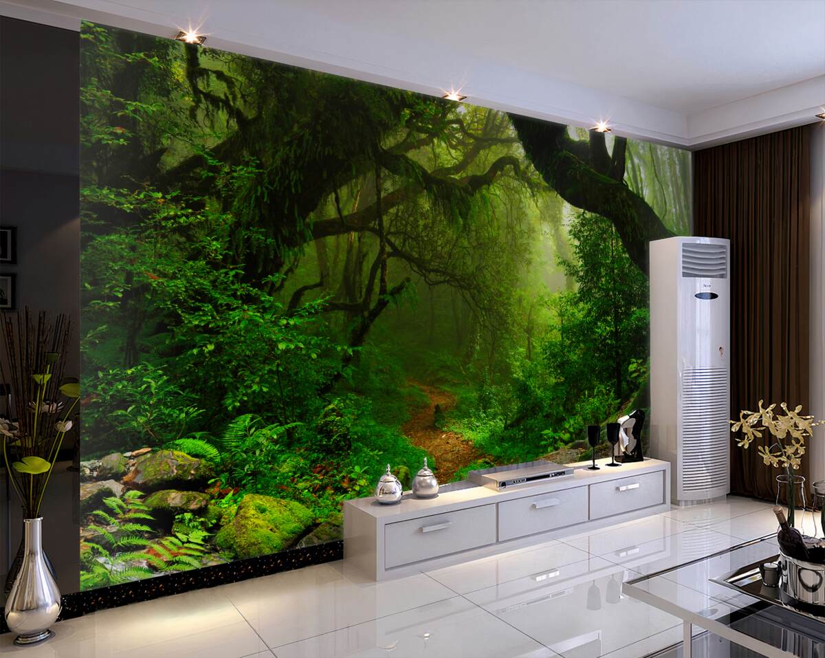 Tapeta Fototapeta ścieżka w zielonym lesie pokrytym (artykuł a97643 ) z kategorii Fototapety Natura